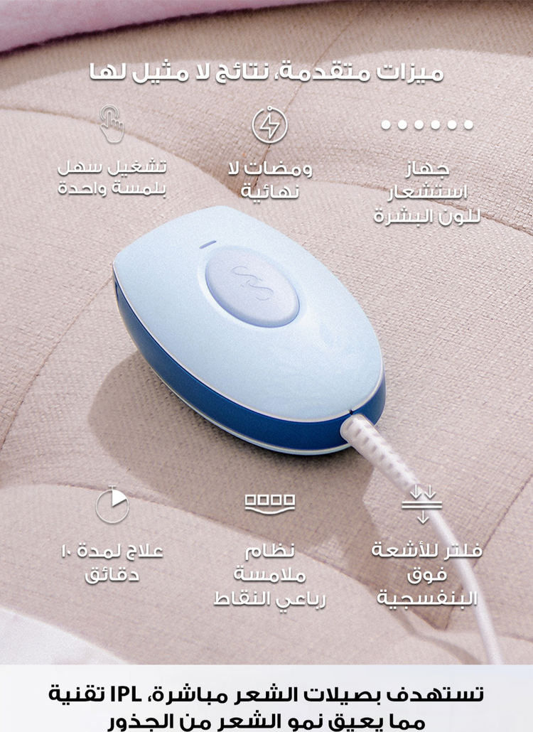 معتمد من إدارة الغذاء والدواء الأمريكية (FDA) للاستخدام على الوجه والجسم — الإبطين، الساقين، خط البيكيني، الظهر، الأصابع، الأصابع القدمين، الشفة العليا. خفيف الوزن، مريح وسهل الاستخدام.