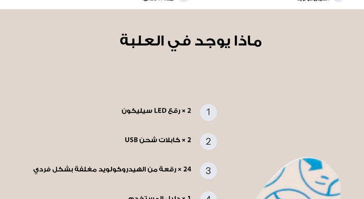 كل رقعة تحتوي على 6 مصابيح LED (3 بالضوء الأحمر بطول موجي 630 نانومتر و3 بالأشعة تحت الحمراء القريبة بطول موجي 833 نانومتر) لتحفيز إنتاج الكولاجين وتقليل علامات التقدم في السن.