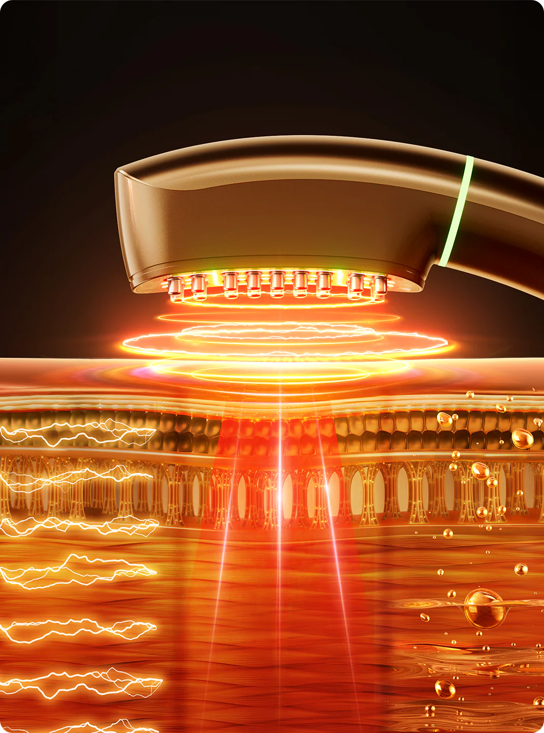 Penetrates deeper with higher energy precision—red light firms, green light calms, for smoother, younger-looking skin.