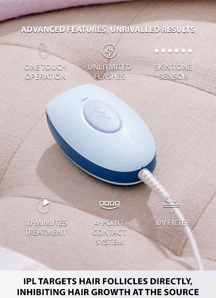 115 flashes per minute, fixed 3 J/cm² power intensity, 1 comfort setting and 2 modes for stamping and gliding